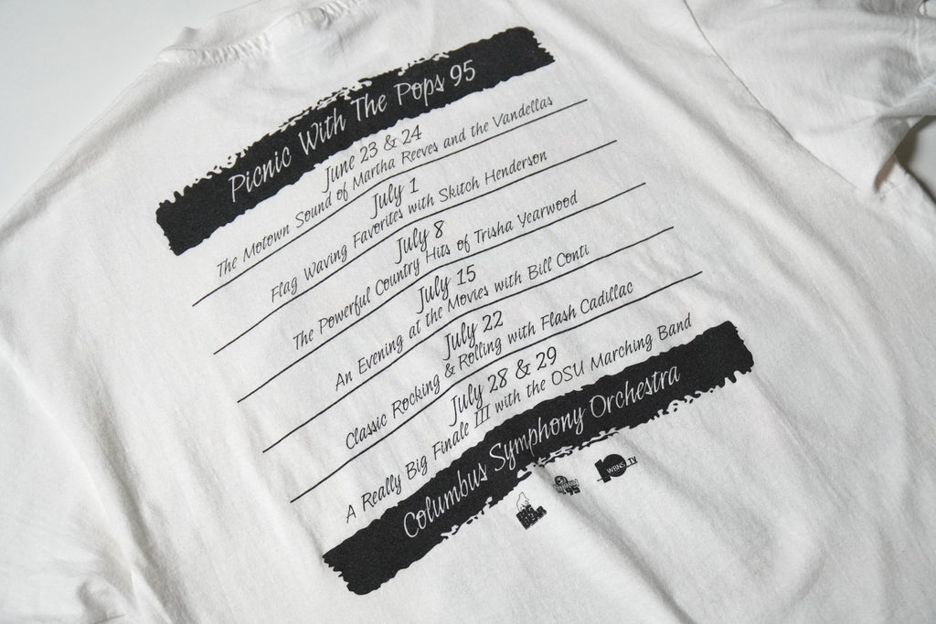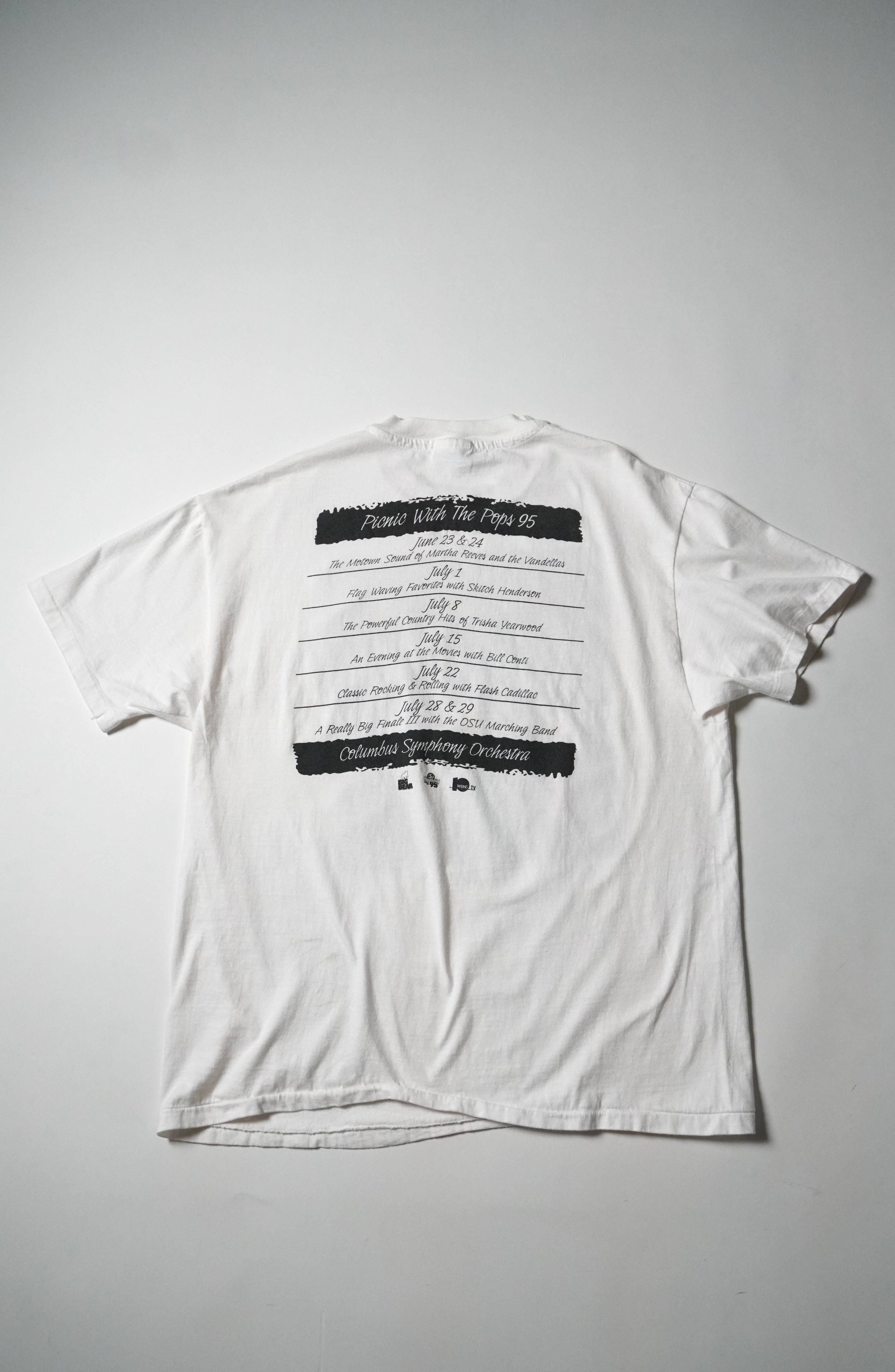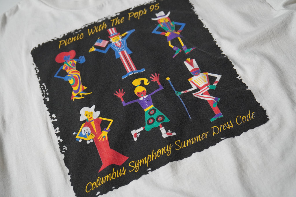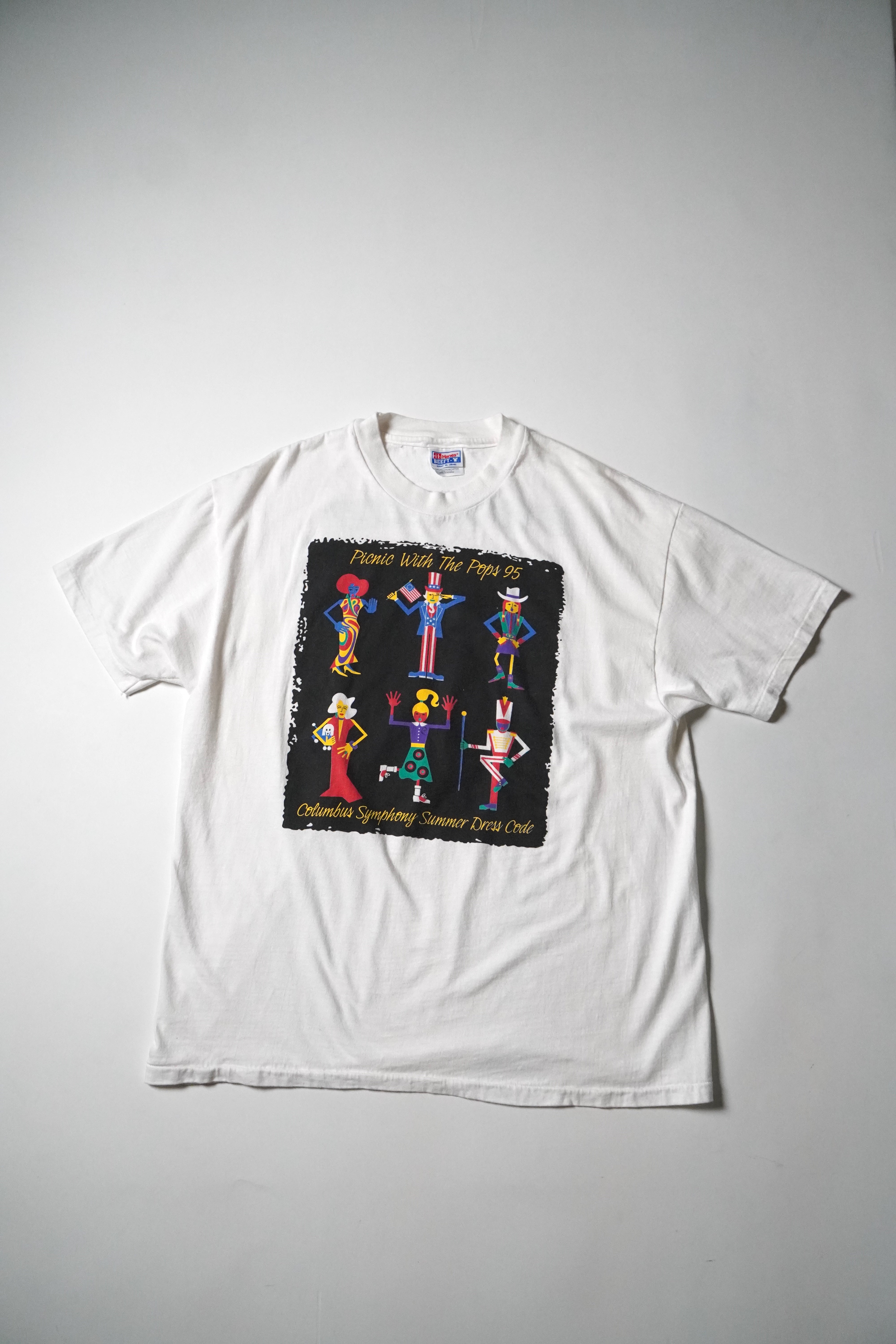 アメリカ・ケンタッキー州レキシントンで開催されている、野外のピクニック&ライブ音楽イベントのTシャツと思われる1着。カーニバルのグラフィックが可愛らしく、雰囲気のあるデザインが魅力。着用感はあるものの目立つ傷や汚れはありません。