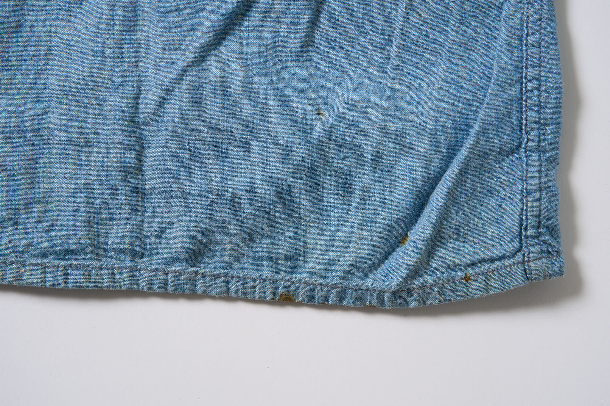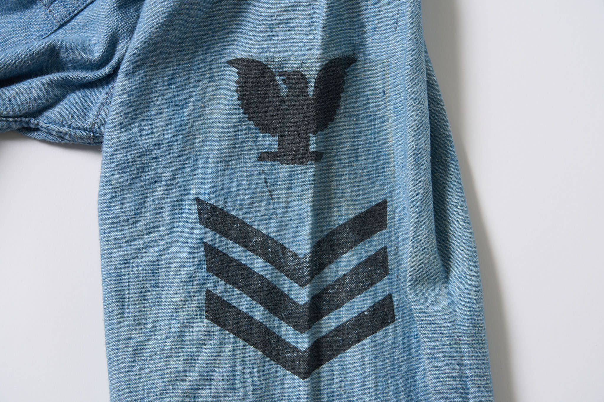 40〜50年代のアメリカ軍のシャンブレーシャツ。セルヴィッジ仕様、ステンシル、階級プリントがすべて揃った珍しい個体です。90年代後半にニューヨークのヴィンテージショップで購入しました。右袖にホール、裾に汚れはありますが着用には支障ありませんし、寧ろ長い年月を重ねた表情として魅力になっていると感じます。サイズは小さめで、日本人のM相当です。コレクションピースに留まらず、普段使いができるヴィンテージシャツだと思います。