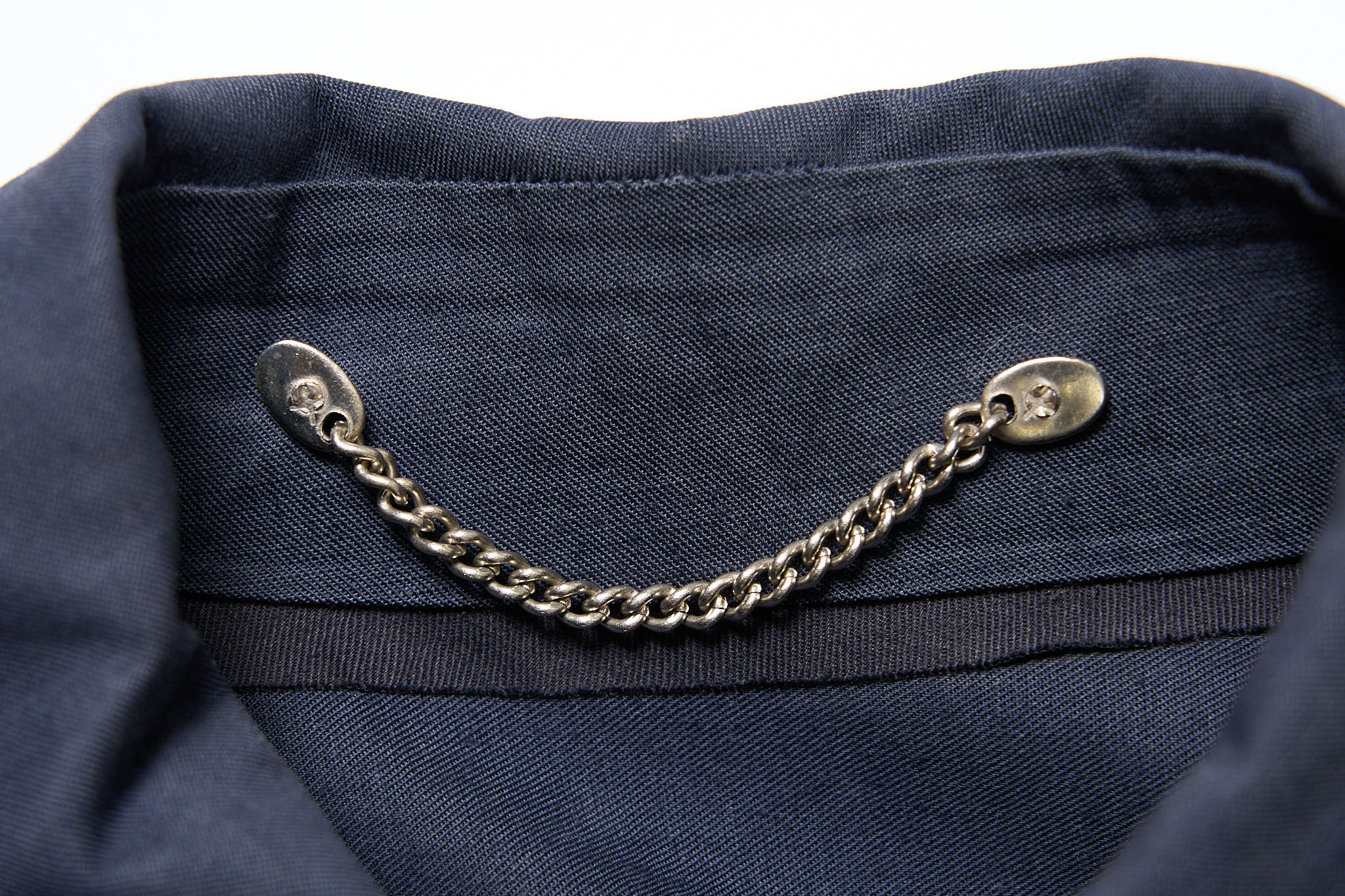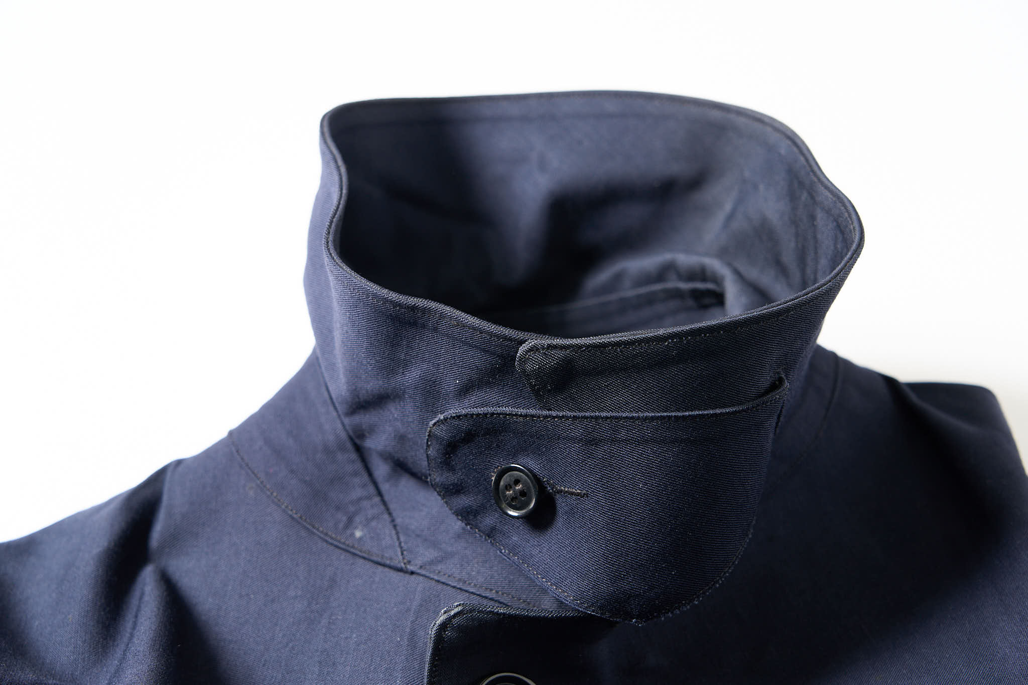 当時の官給品やワークウエアを思わせる実用的なアイテムです。ゴム引きコットン素材を使用し、内側の縫製部分はすべてラバーシームテープ処理が施されている本格的な防水仕様で、首元にはクラシックなチェーンフック、脇下には4連のベンチレーションハトメが付いています。圧倒的にブラックが多いイギリス官給品のなかでも、管理職・外勤用だったと思われるネイビーはあまり見かけません。デッドストックとなればなおさら希少性は高まります。サイズはゴールデンサイズの7です。