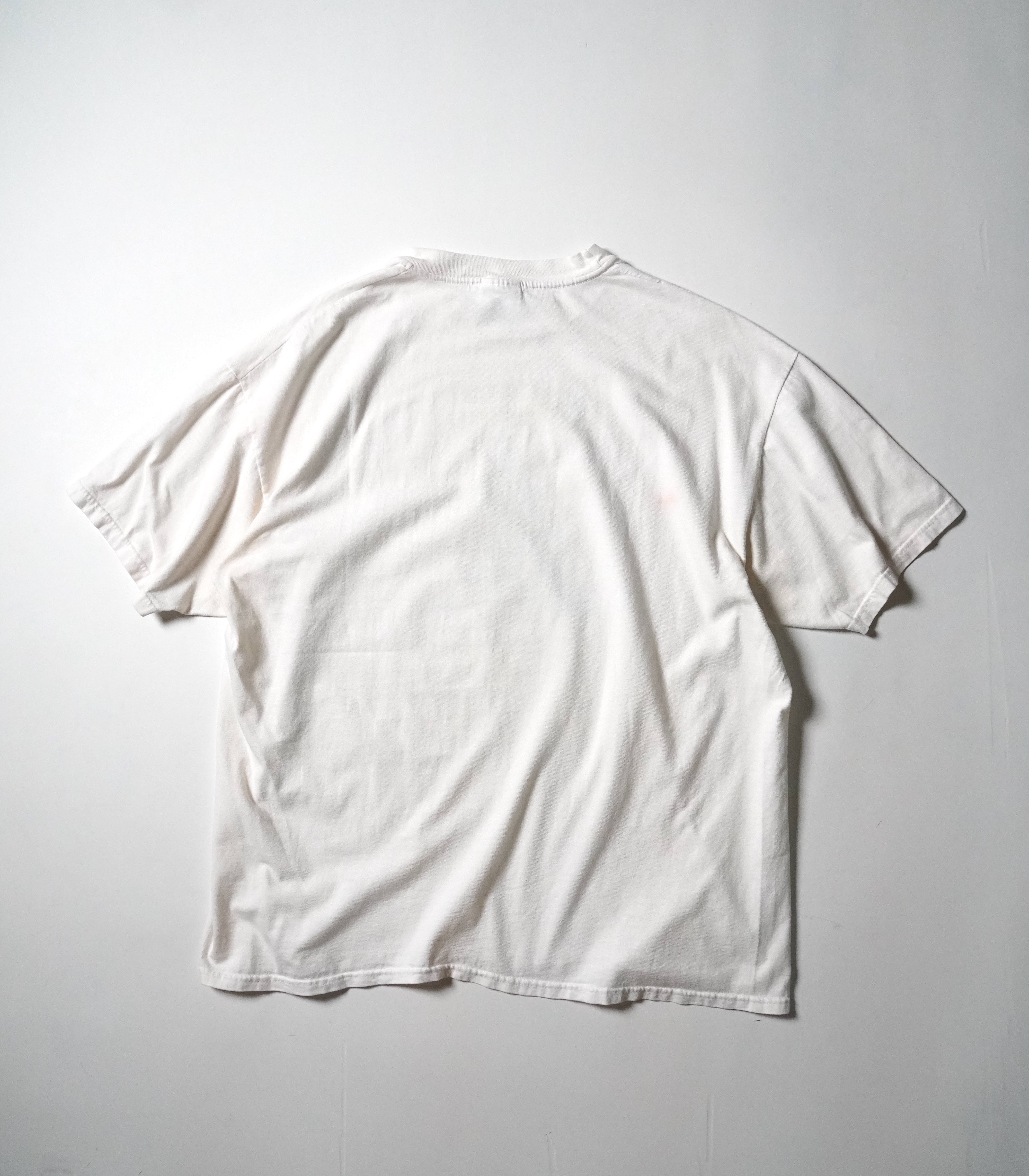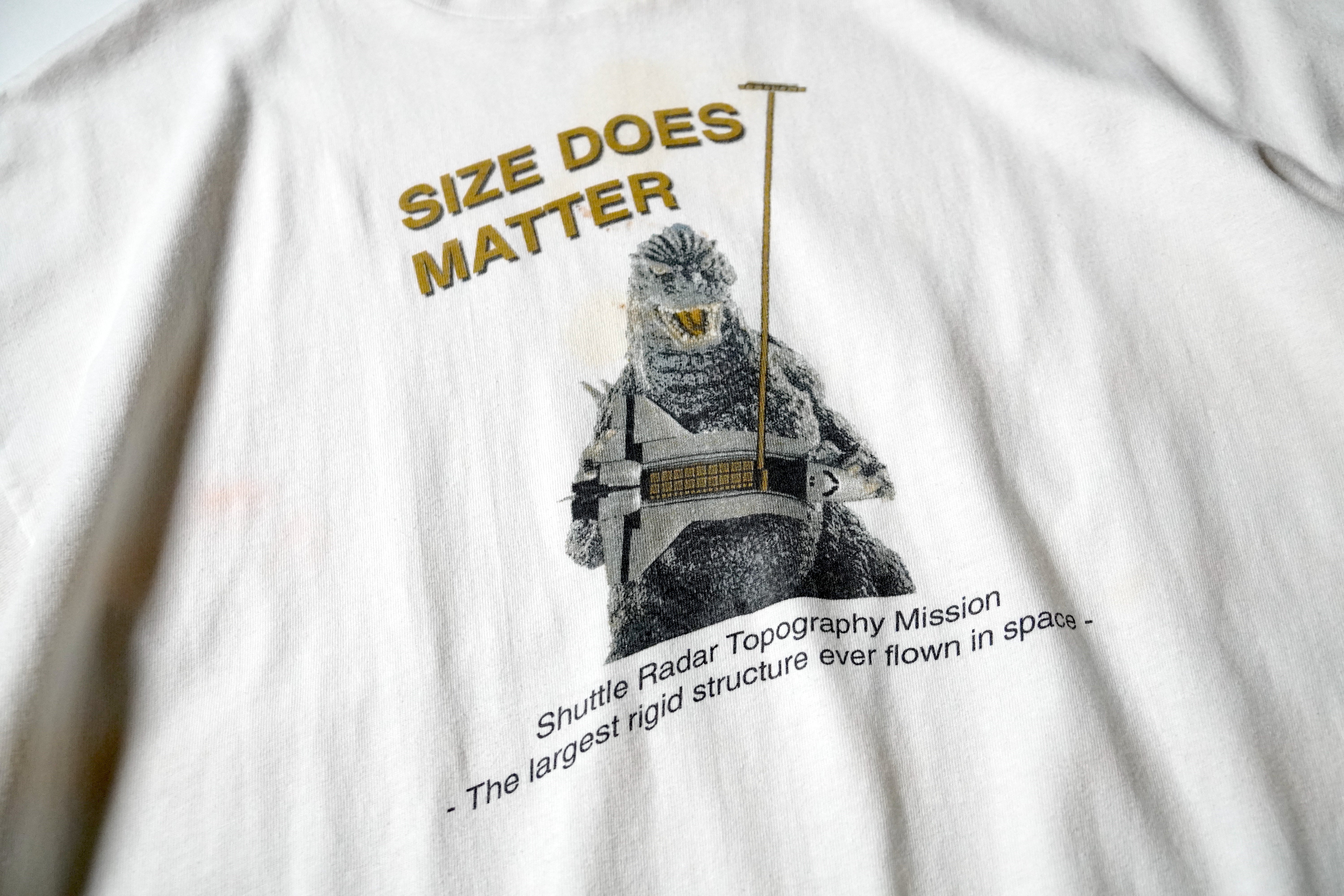 ゴジラのグラフィックが印象的なTシャツを買い付け。和訳によると「シャトルレーダー地形探査ミッション」とあり、宇宙で運用された史上最大級の剛体構造体をゴジラが掴み、「サイズは重要だ」と書かれている。意味は正直よくわからないが、グラフィックのインパクトは抜群。ところどころに汚れやシミがあるが、嬉しいXLサイズ。