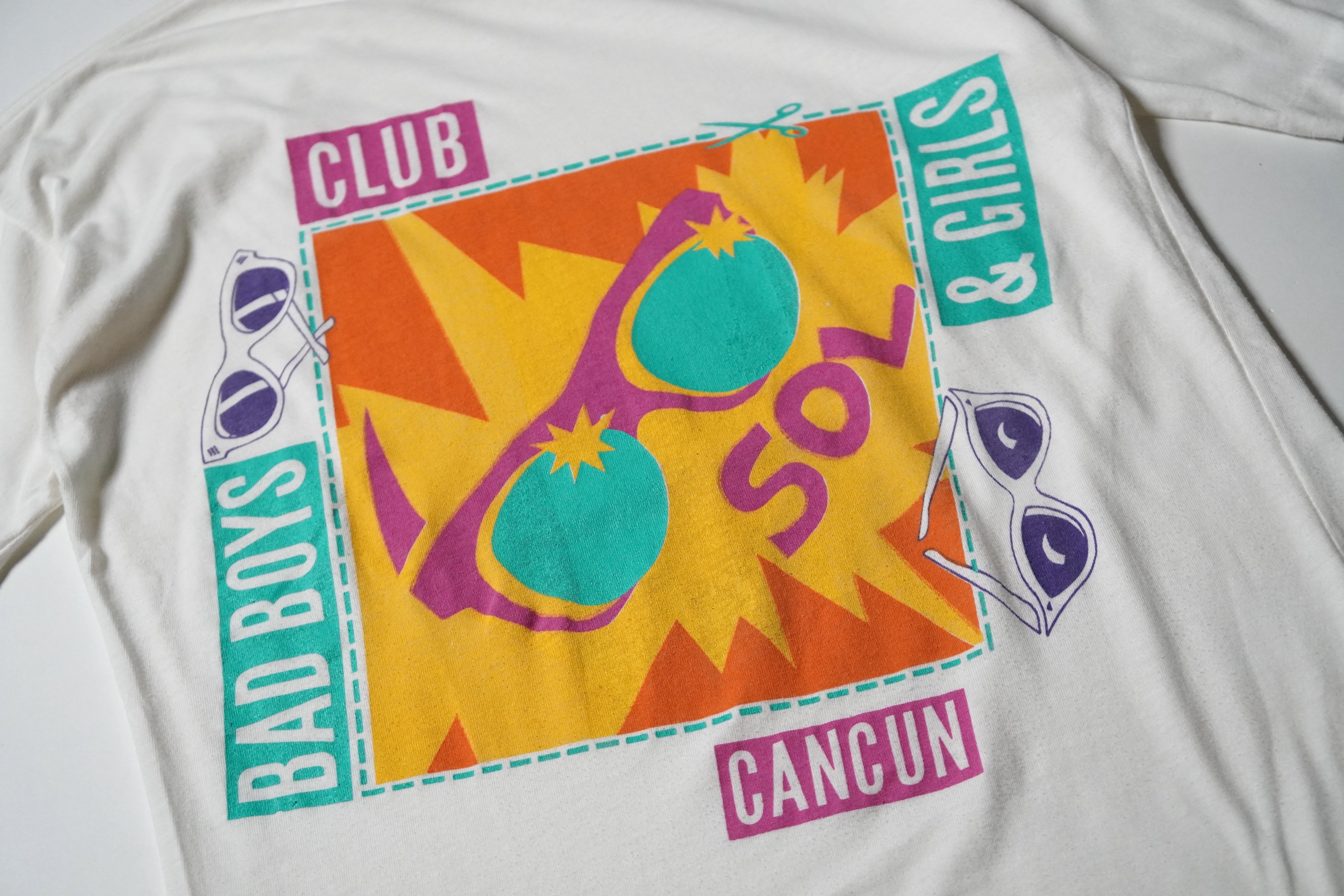 メキシコ南東部のリゾート地、カンクンのナイトクラブのTシャツ。ポップなグラフィックが印象的で、夏場は1枚でも主役になるアイテム。比較的きれいなコンディションです。