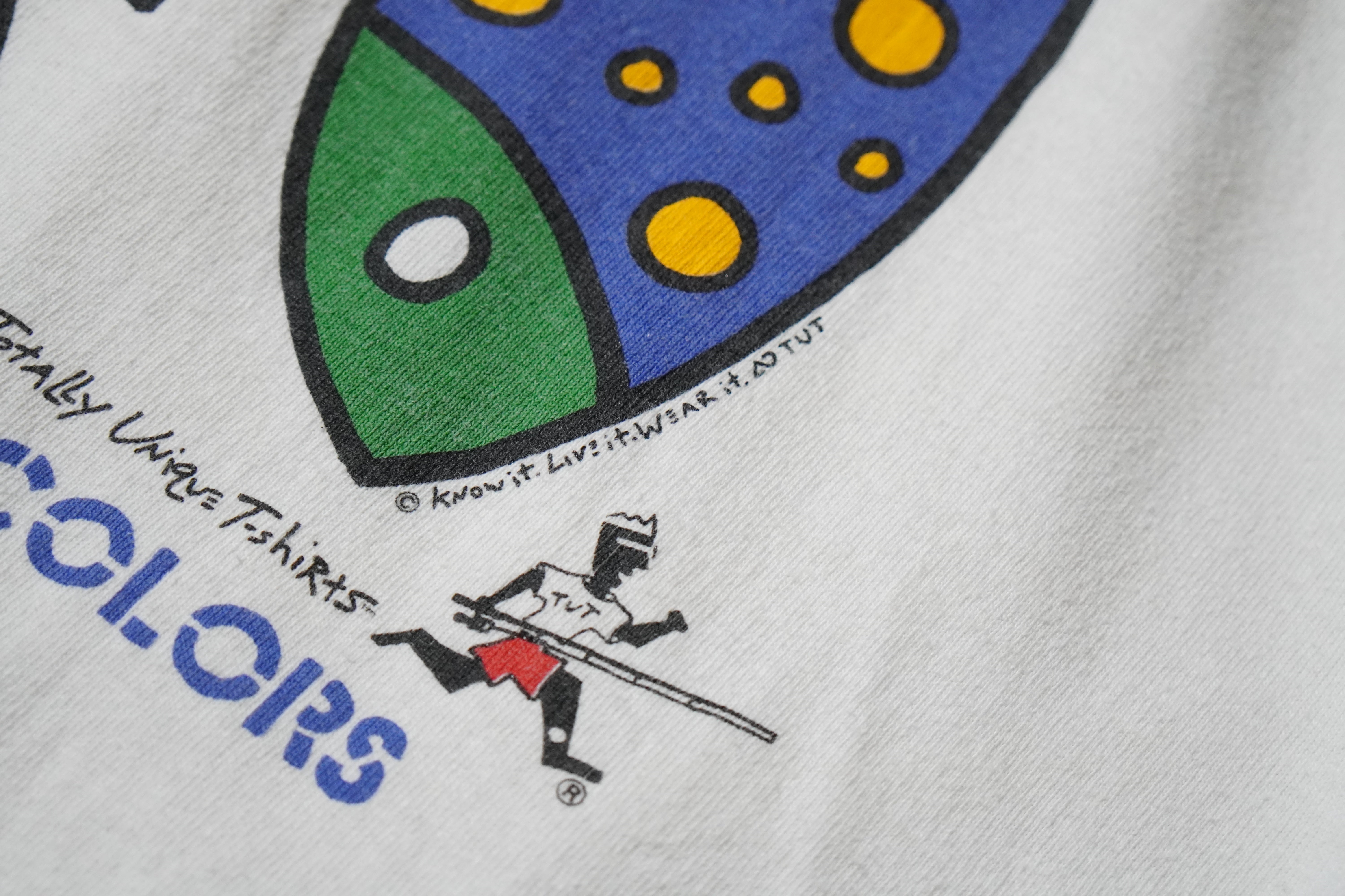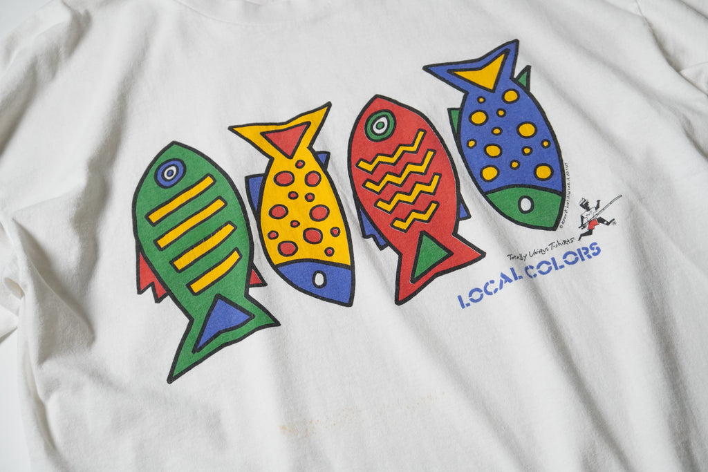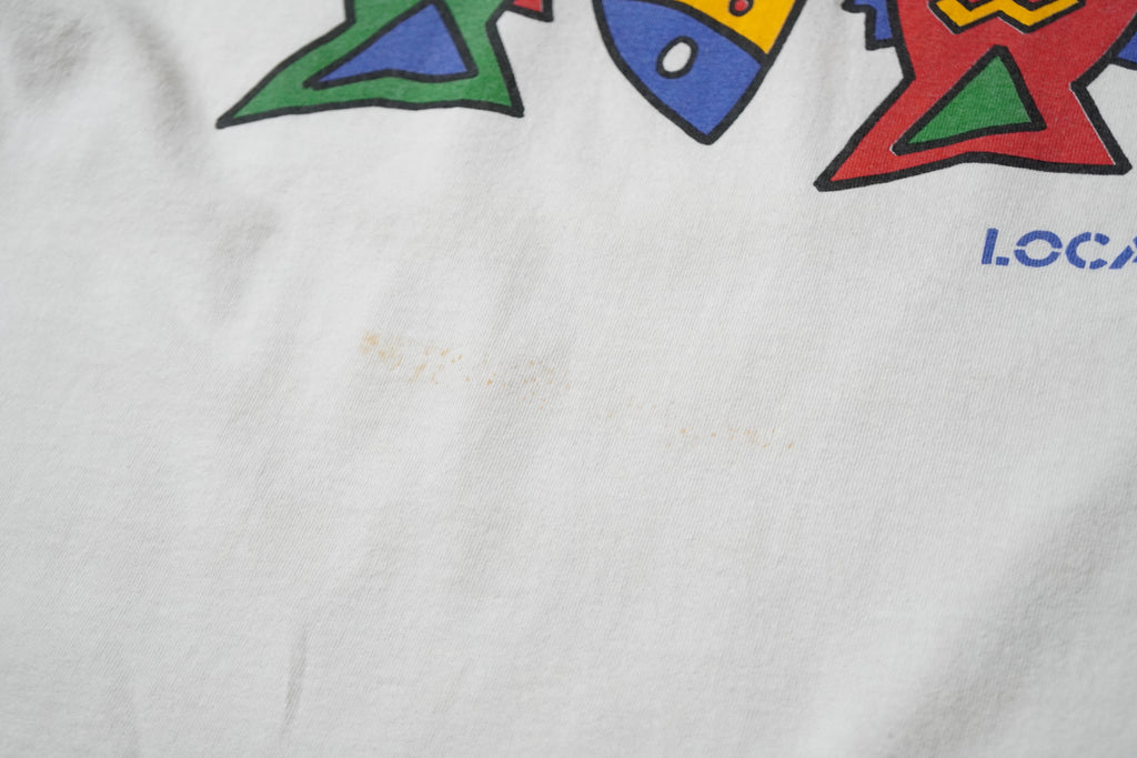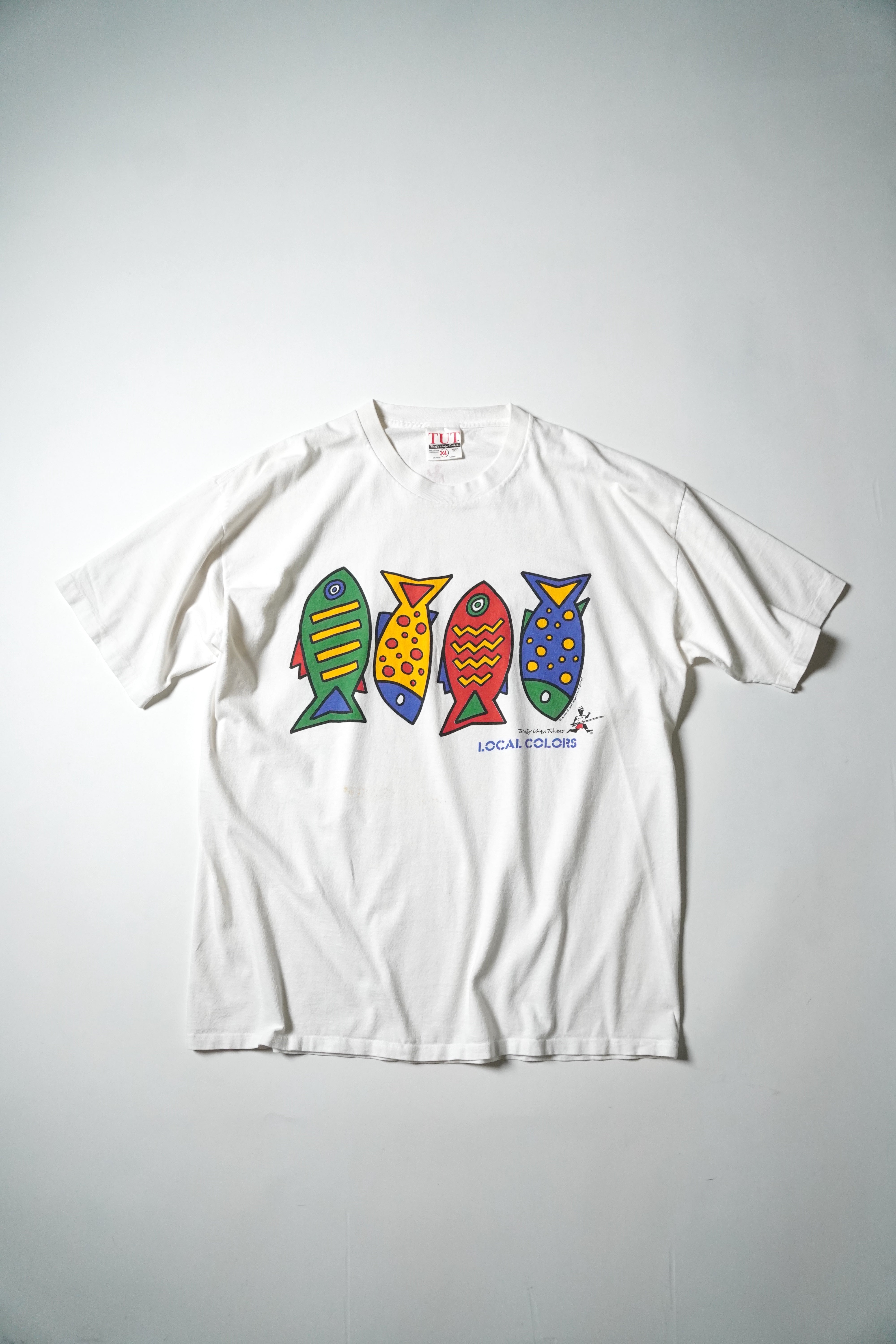 「Totally Unique T-Shirt」製の魚柄Tシャツ。ピカソを思わせる抽象的なタッチで描かれたグラフィックが特徴的。詳細は不明だが、ユーモアの効いたデザインが魅力の1着。若干の汚れがありますので写真にてご確認ください。