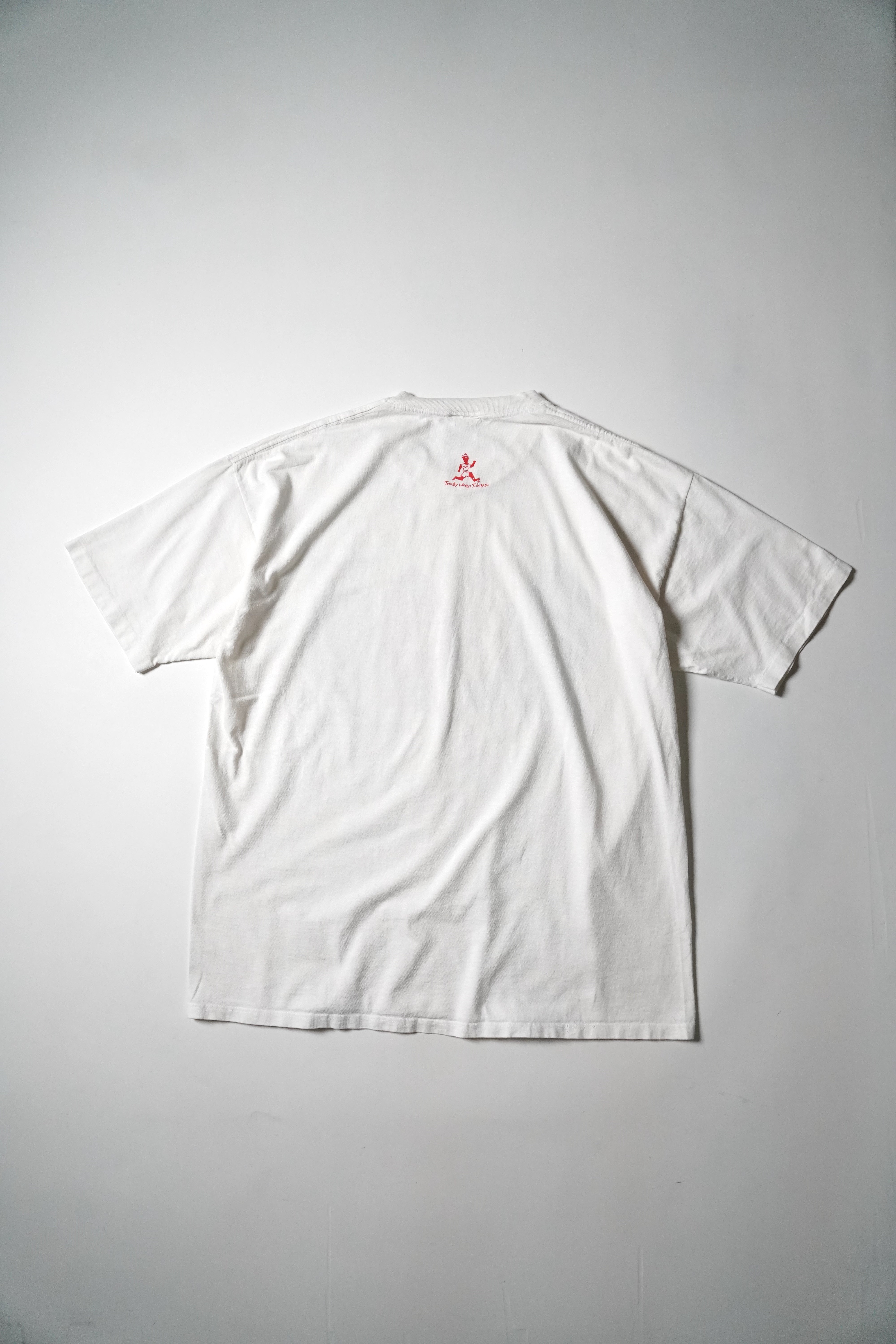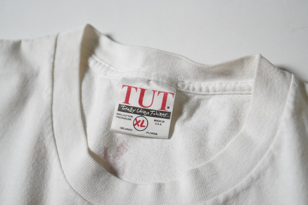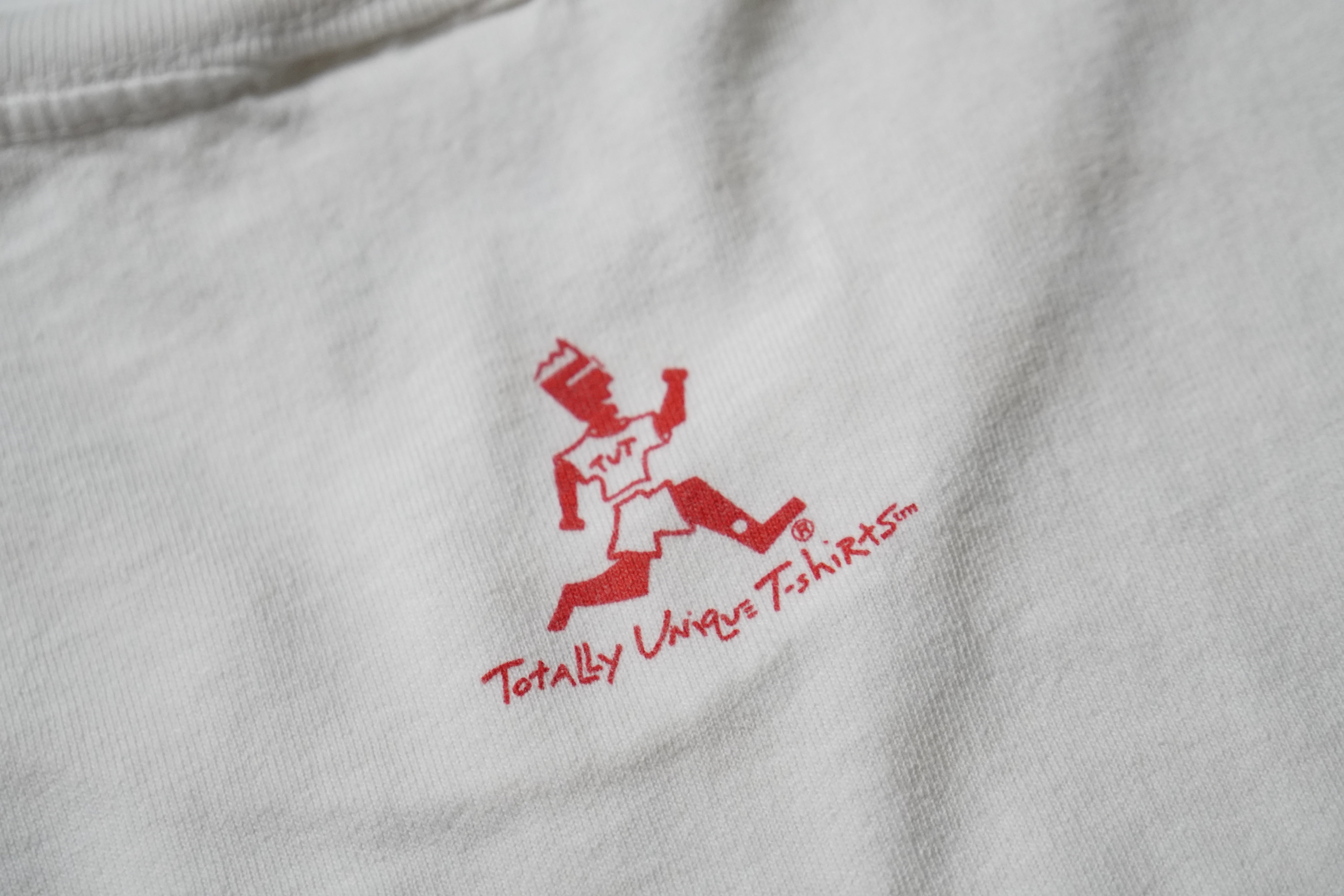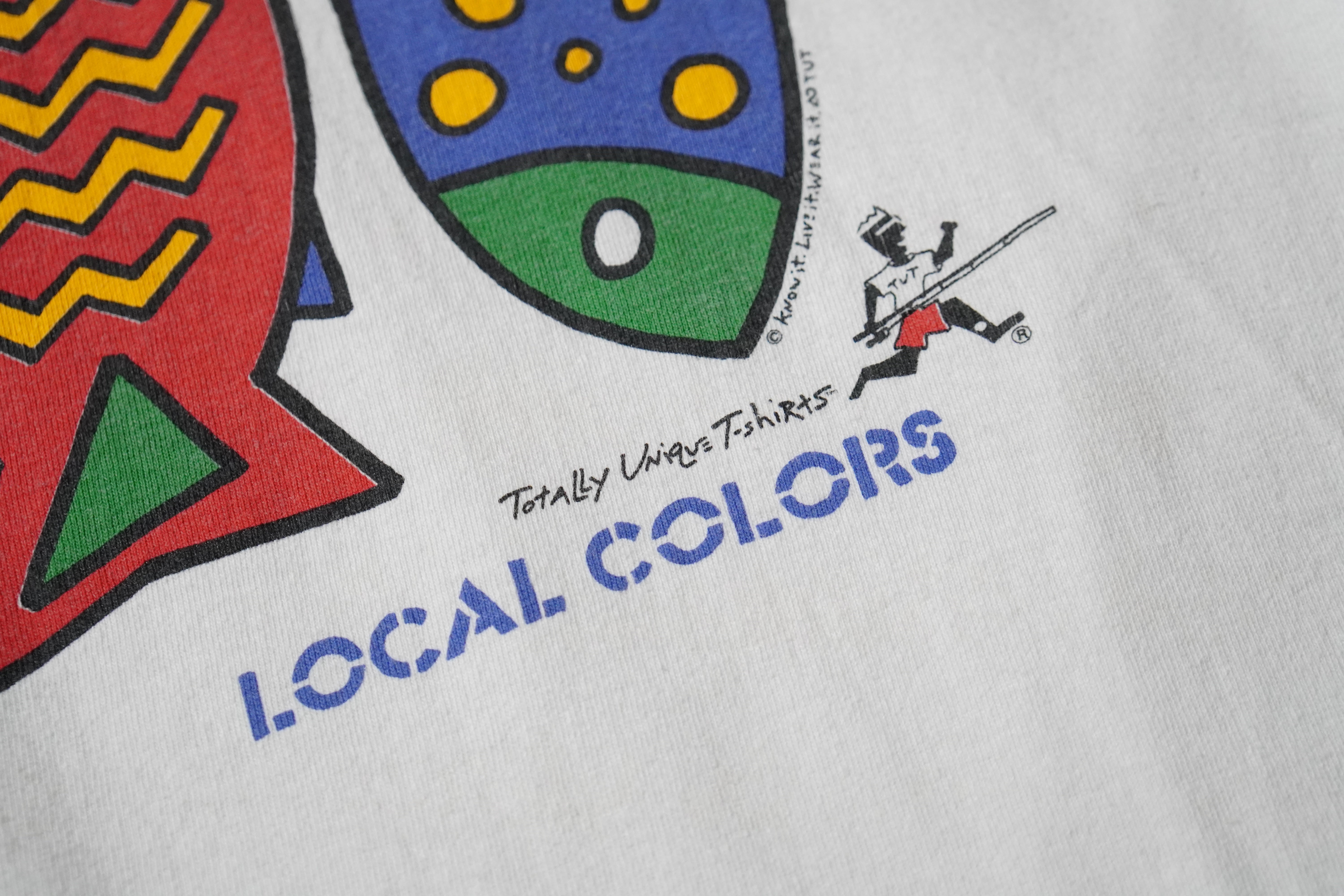 「Totally Unique T-Shirt」製の魚柄Tシャツ。ピカソを思わせる抽象的なタッチで描かれたグラフィックが特徴的。詳細は不明だが、ユーモアの効いたデザインが魅力の1着。若干の汚れがありますので写真にてご確認ください。