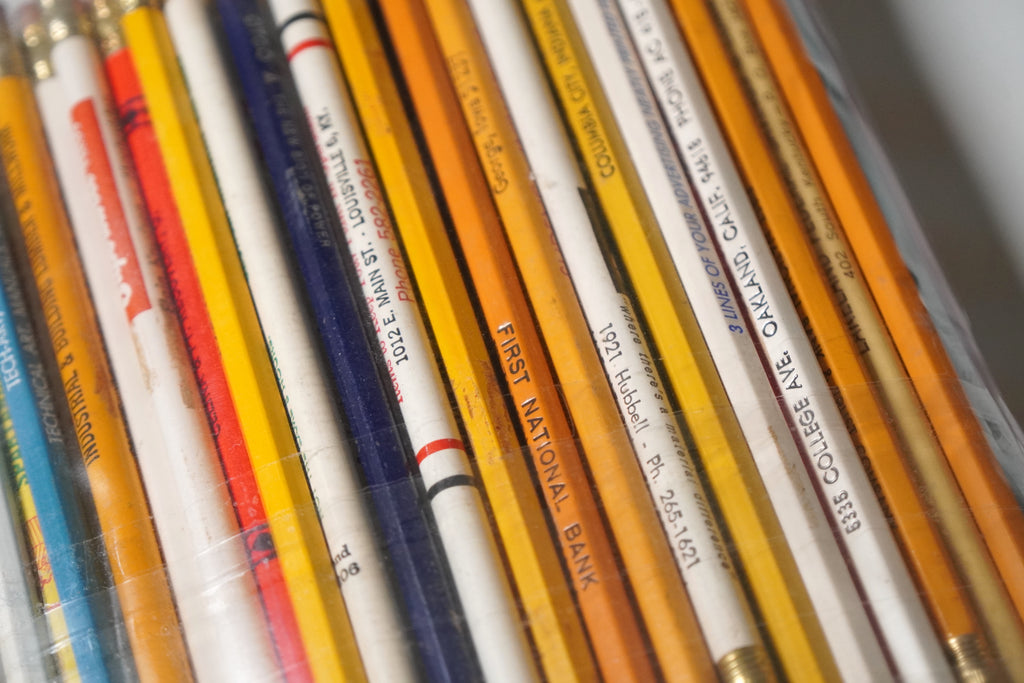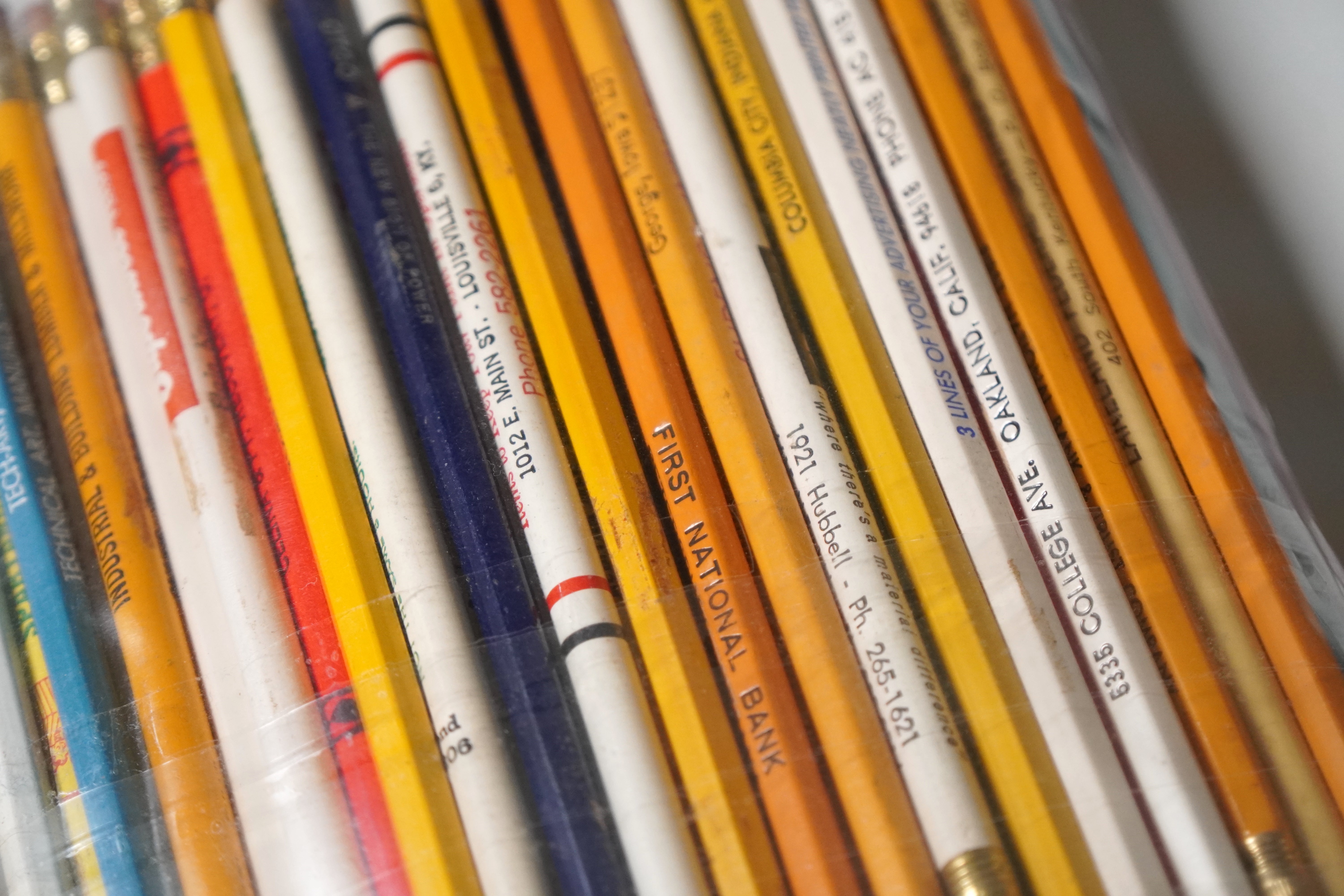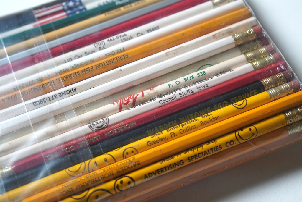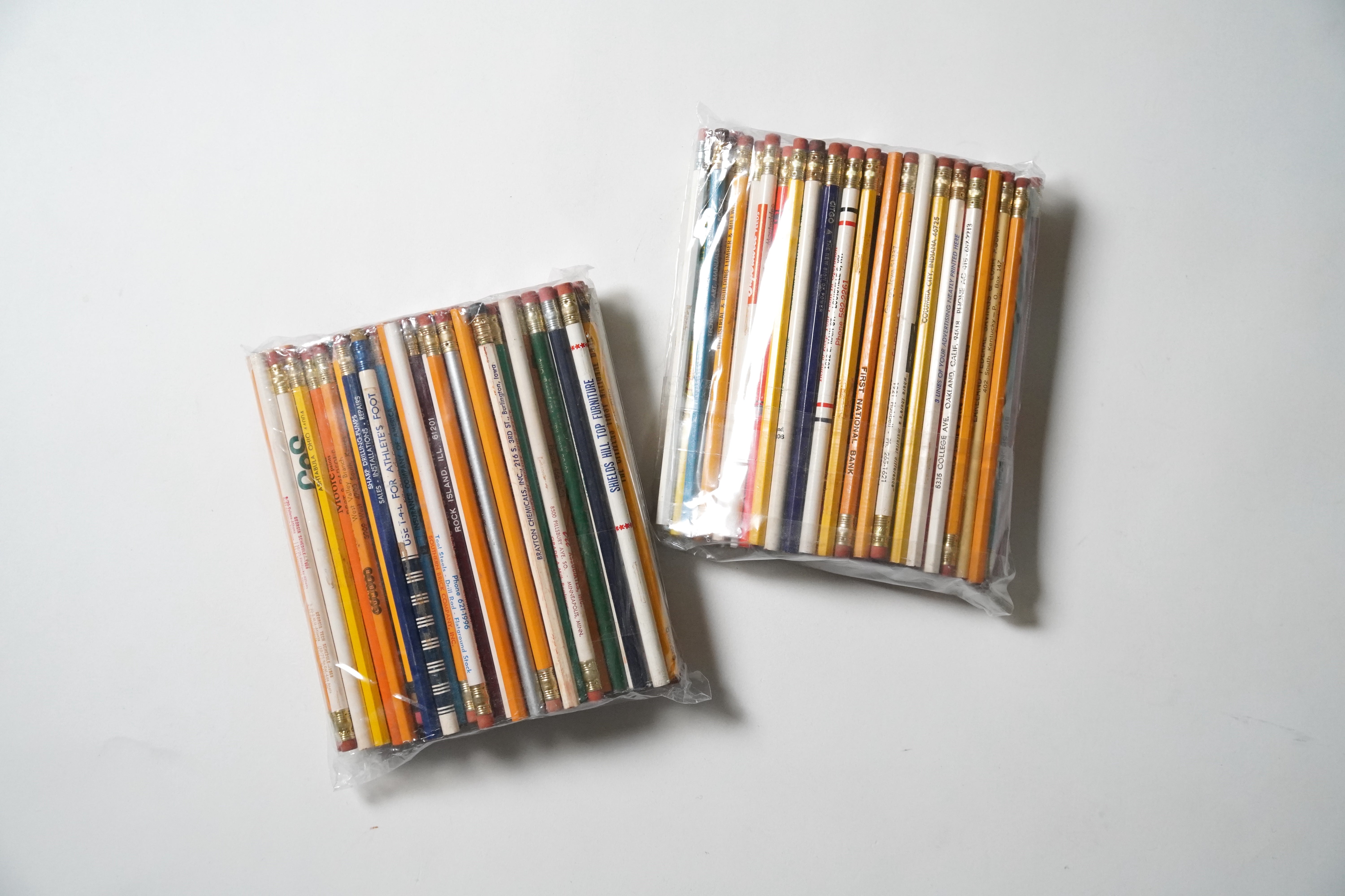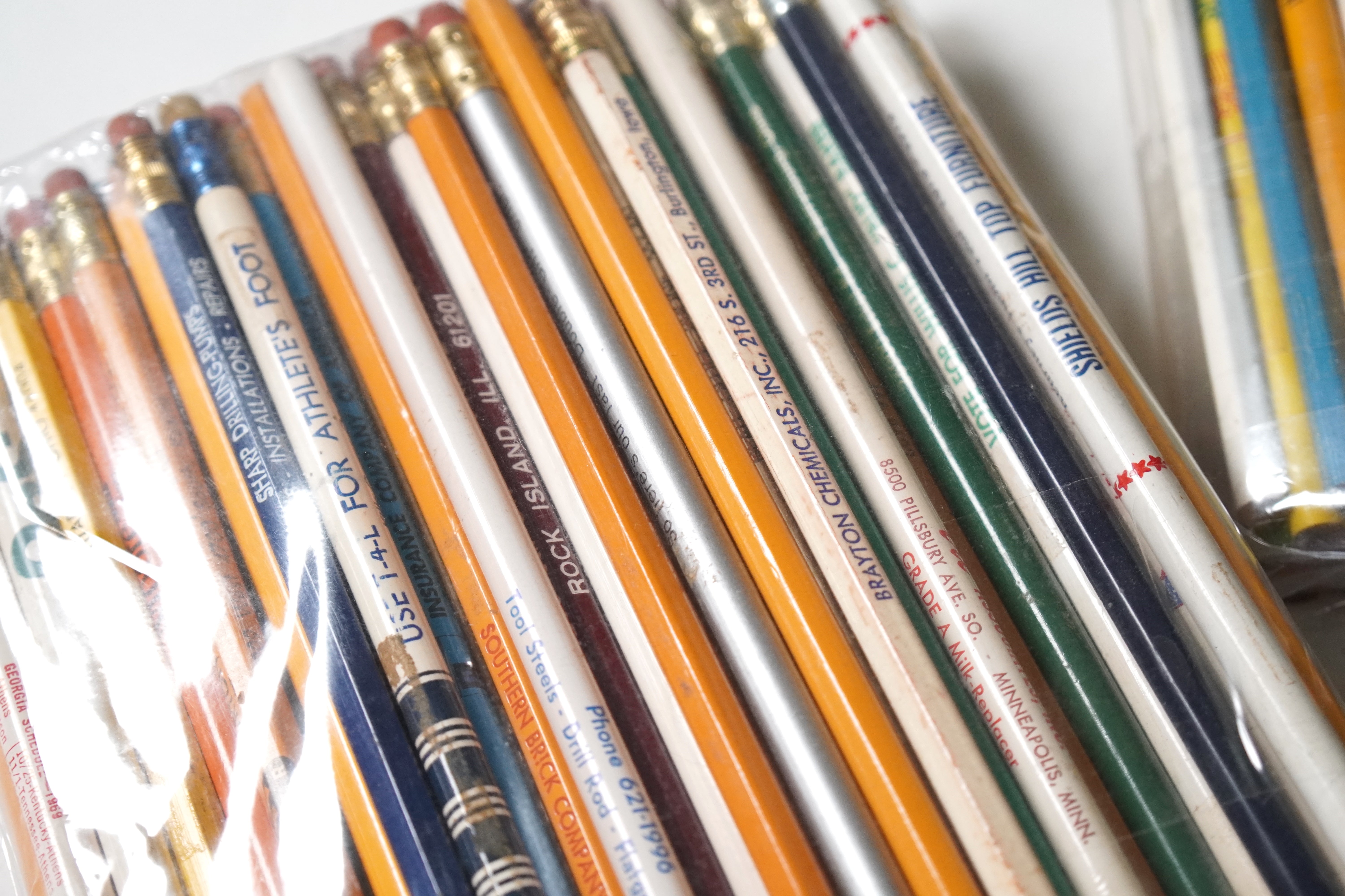 ヴィンテージのアドバタイジング鉛筆セット。色も種類もさまざまで、眺めているだけでも楽しい。デスクに並べれば、ちょっとした会話のきっかけになること請け合い。田舎のアンティークショップで出会ったおばあさん曰く「100本セットよ」とのこと。数えていないので、もし足りなかったらご容赦を。